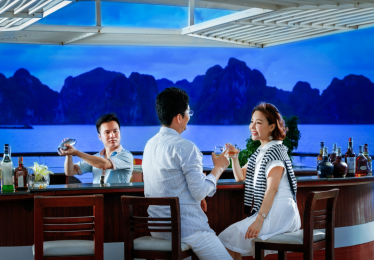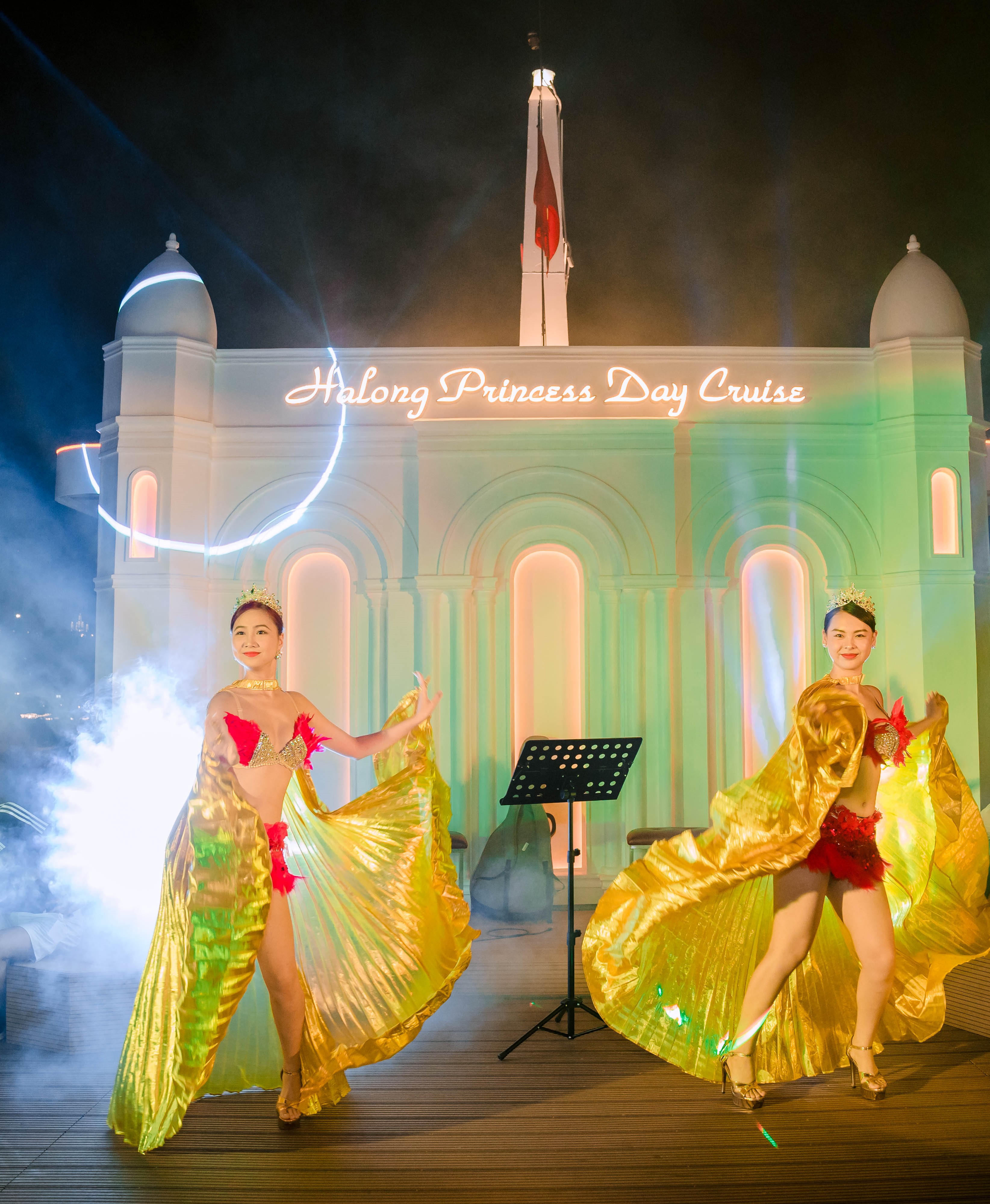 Cruise departs along to the coastline (Halong Sunworld Park) for dinner, during the tour guests will have International buffet dinner. Enjoy live music performed by Vietnamese traditional and International Filipino band with dancers.